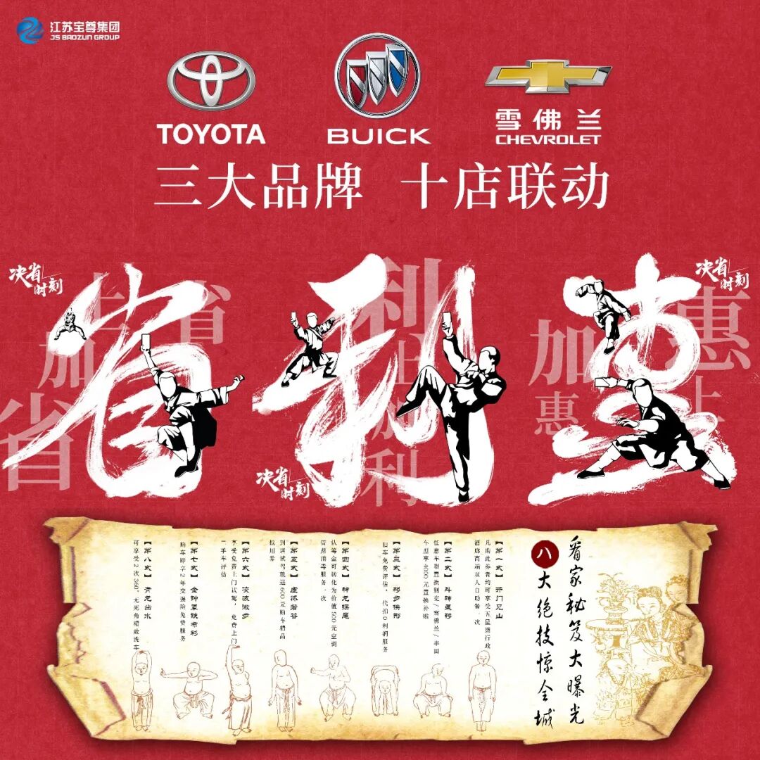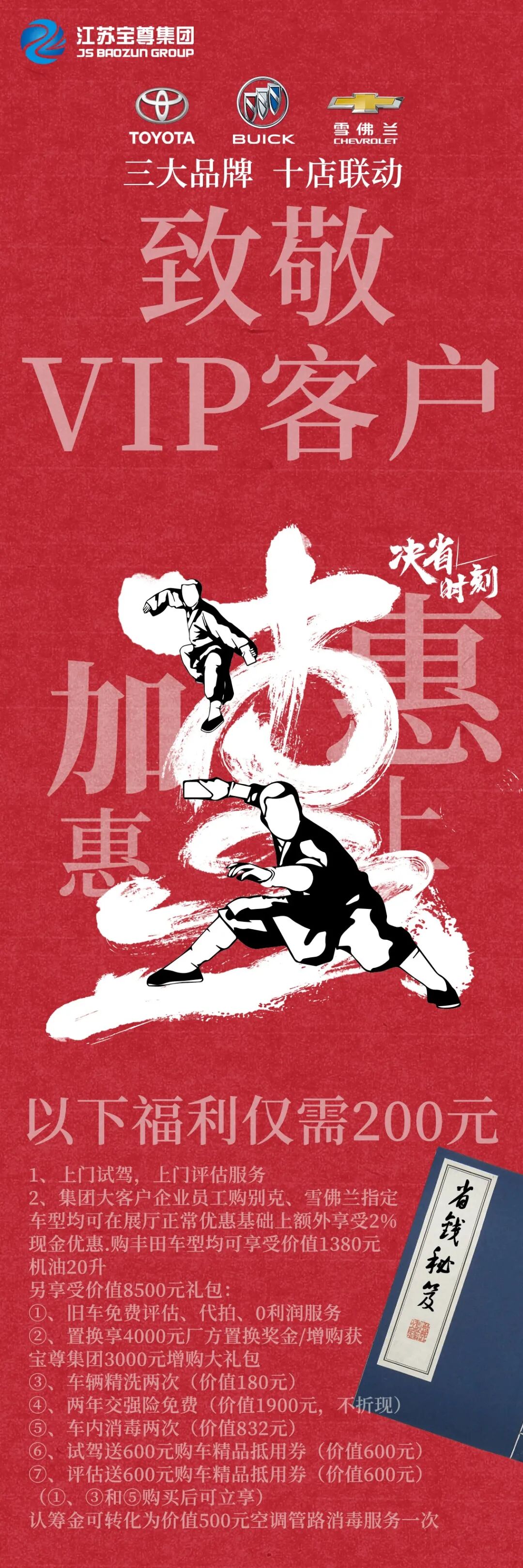“省”“利”“惠”最优惠的购车折让! 打包送给你! 你品!你细品! 老车主置换正当时 我们用最诚意的置换政策向您致敬 我们将为您免费评估爱车,并帮您在线上免费代拍,零利润为您服务 置换享受4000元厂方置换补贴 增购享受3000元宝尊集团增购礼包 星级酒店自助餐券两张(价值388元) 车辆精洗服务两次(价值180元) 两年交强险免费(价值1900元) 车内消毒两次(价值832元) 试驾送600元购车精品抵用券 评估送600元购车精品抵用券 认筹金可转为价值500元空调管路消毒服务 重要信息小编已为您划上重点 你品!你细品!